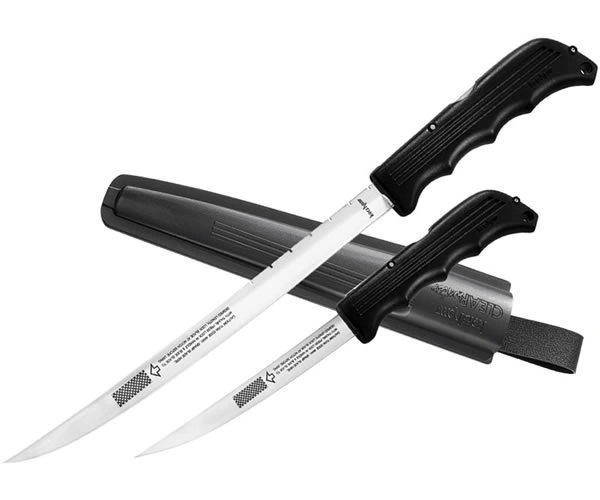 The Kershaw 7 Step Fillet Knife model 1240 has a blade with notches in it. These notches allow you to adjust the length of the blade from 5.5 to 9 inches, wich increments in-between. This comes in handle with performing fillet tasks because the length of the knife blade when preparing fish is very important. The handle is comfortable and designed to reduce fatigue. A plastic sheath is included with the 7 Step Fillet Knife.