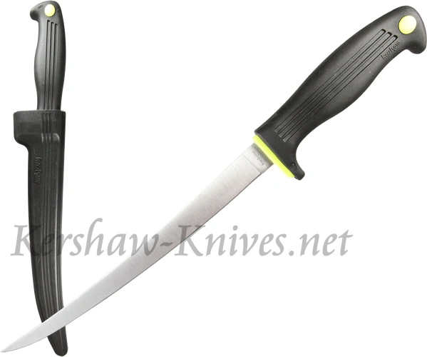 The high carbon stainless steel blade of the Kershaw Fillet Knife model 1259 is 9.25 inches long. The flex in the blade makes filleting a quick and easy task. The handle is a co-polymer that lets the user maintain a firm grip in wet conditions while reducing fatigue. Neon accents make the 1259 easy to spot when needed. A sheath is included to protect the blade.