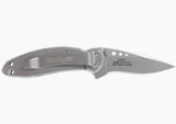 The Kershaw Scallion 1620FL is unique because it is a frame lock version of the Scallion models. This knife comes in a gray 410 stainless steel handle and a 420HC stainless steel fine edge blade. The size of this knife is slightly larger than the Chive and smaller than the Leek. Some say the size is just right. The three holes in the blade are no longer being manufactured, if you buy this model the blade will be without any holes, as seen in last picture with the logo engraved.