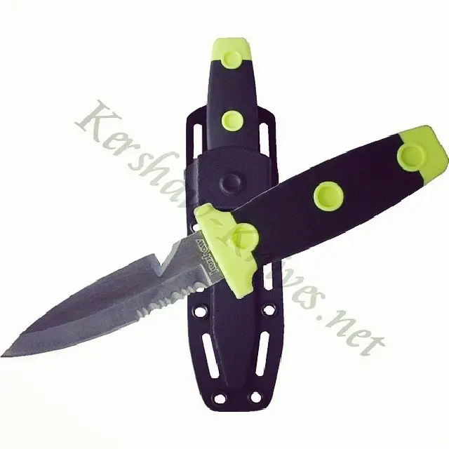 Kershaw Sea Hunter Knife 1008, the perfect diving knife. Corrosion resistant stainless steel blade, bright neon detailing, hard-molded sheath, soft molded handle, and 2 rubber straps. Sharpened notch on blade for cutting through cord or fabric. Pick some up for your crew at www.Kershaw-Knives.net