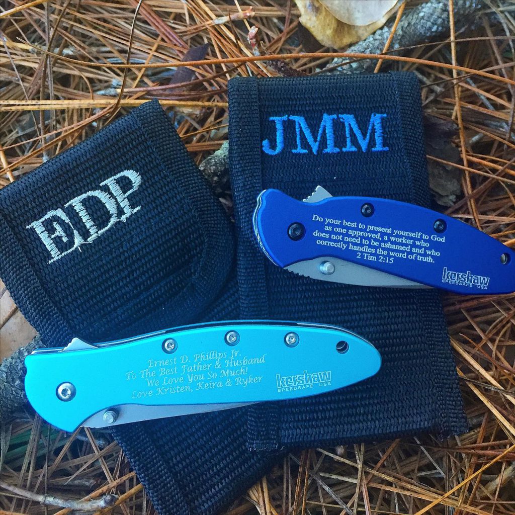 Getting orders shipped out for Father’s Day! Say I love you to your Father- Husband-Grandad-Best Friend or Father Figure with a Kershaw knife. This is a turquoise leek 1660 and a navy scallion 1620 each paired with an embroidered sheath.