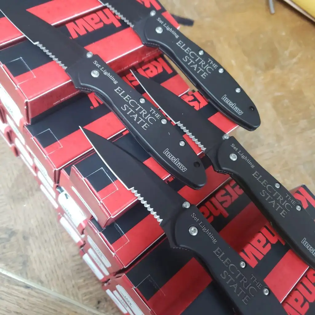 It may not seem like movie stuff gets made right here in DeRidder Louisiana, but it does. Here is a boatload of knives for the set lighting crew on a moving coming out by Netflix in 2024. It is a sci-fi movie called The Electric State. Kershaw-Knives.net